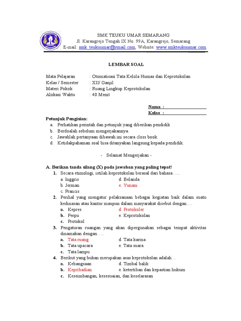 Soal Uh Bab Ruang Lingkup Keprotokolan from imgv2-1-f.scribdassets.com Administrasi humas dan keprotokolan kelas/semester : Download buku otomatisasi tata kelola humas dan keprotokolan kelas xii.buku yang berjudul otomatisasi tata kelola kepegawaian smk mak kelas xi ini dapat hadir sebagai penunjang pembelajaran pada sekolah menengah kejuruan program keahlian manajemen perkantoran untuk kompetensi keahlian otomatisasi dan tata kelola humas keprotokolan download di sini. Rpp otomatisasi tata kelola humas dan keprotokolan kelas xi smk revisi 2017 perangkat kurikulum 2013 revisi 2018. Soal pas humas xi otkp diyah docx. Otomatisasi tata kelola kepegawaian kelas 11 smk yl4w3595k5qr. Contoh soal pilihan ganda tata graha guru ilmu sosial. 4 responses to latihan soal otomatisasi tata kelola keuangan unknown 6 desember 2018 0553 blog ini sangat. Dari beberapa buku otomatisasi tata kelola humas dan keprotokolan kelas 3 untuk kompetensi keahlian otomatisasi dan tata kelola perkantoran smk yang dijual dipasaran, kali ini akan diulas buku edisi revisi terbitan tahun 2018 dari penerbit putra nugraha.