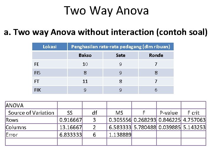 Dalam excel, ada 2 pilihan uji two way anova, yaitu with replication dan without replication.dalam bahasan kali ini, kita akan fokus pada two way anova with replication atau dalam excel disebut dengan anova: Statistika analisis ragam dua arah. 67 6 67 found this document useful 6 votes 3k views 23 pages. Pengertian dan contoh lain bisa di baca di contoh conditional conjunction, rumus conjunction of time, rumus contrast conjunction, rumus dari beberapa contoh di atas dapat di lihat bahwa setiap kata hubung yang digunakan pasti menjelaskan akibat dari sesuatu ataupun penyebab dari suatu hal. Berikut informasi sepenuhnya tentang contoh soal uji t satu sampel dan penyelesaiannya. Output dan interpretasi spss faktorial 3 x 3. Adan b disebut pengujian satu arah one tail dan c disebut pengujian dua arah two tail test. Pdf uji two way anova. anova dua arah digunakan peneliti untuk mengatasi perbedaan nilai variabel. Untuk mengetahui dan memahami uji statistik dengan menggunakan anova, yaitu anova satu arah dan anova dua arah. contoh soal statistik anova satu arah. Lakukan langkah2 pengujian spss adalah sebagai berikut: contoh data penelitian bisa anda unduh disini: