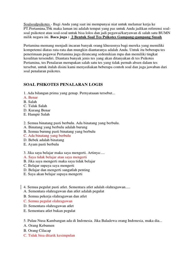 Diperusahaan bumn pt pertamina (persero), kami menyediakan contoh soal dan . Ternyata ada banyak jenis soal yang ada di tes rekrutmen pertamina. Pertamina group membuka rekrutmen pertamina 2021 sejak juni 2021 untuk jenjang s1/d4. Download soal tes pertamina 2019 pdf 1100 mb sampdf sampdf soal tes psikotes online pertamina bumn terbaru 2020 part 1 pada video di atas . Beberapa contoh soal dan juga jawaban dari soal penalaran psikotes.